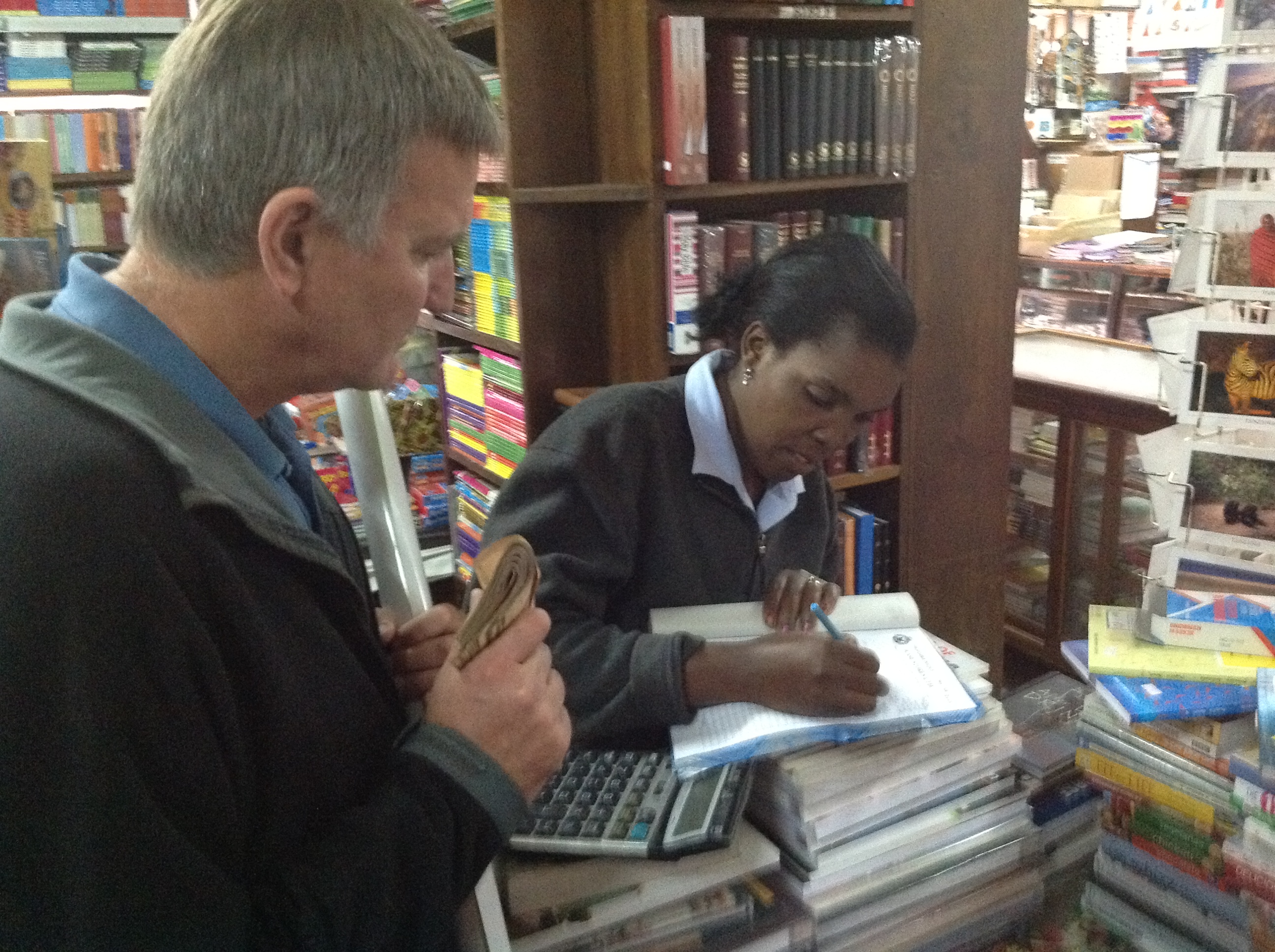 (Tim purchasing books at the local bookstore)